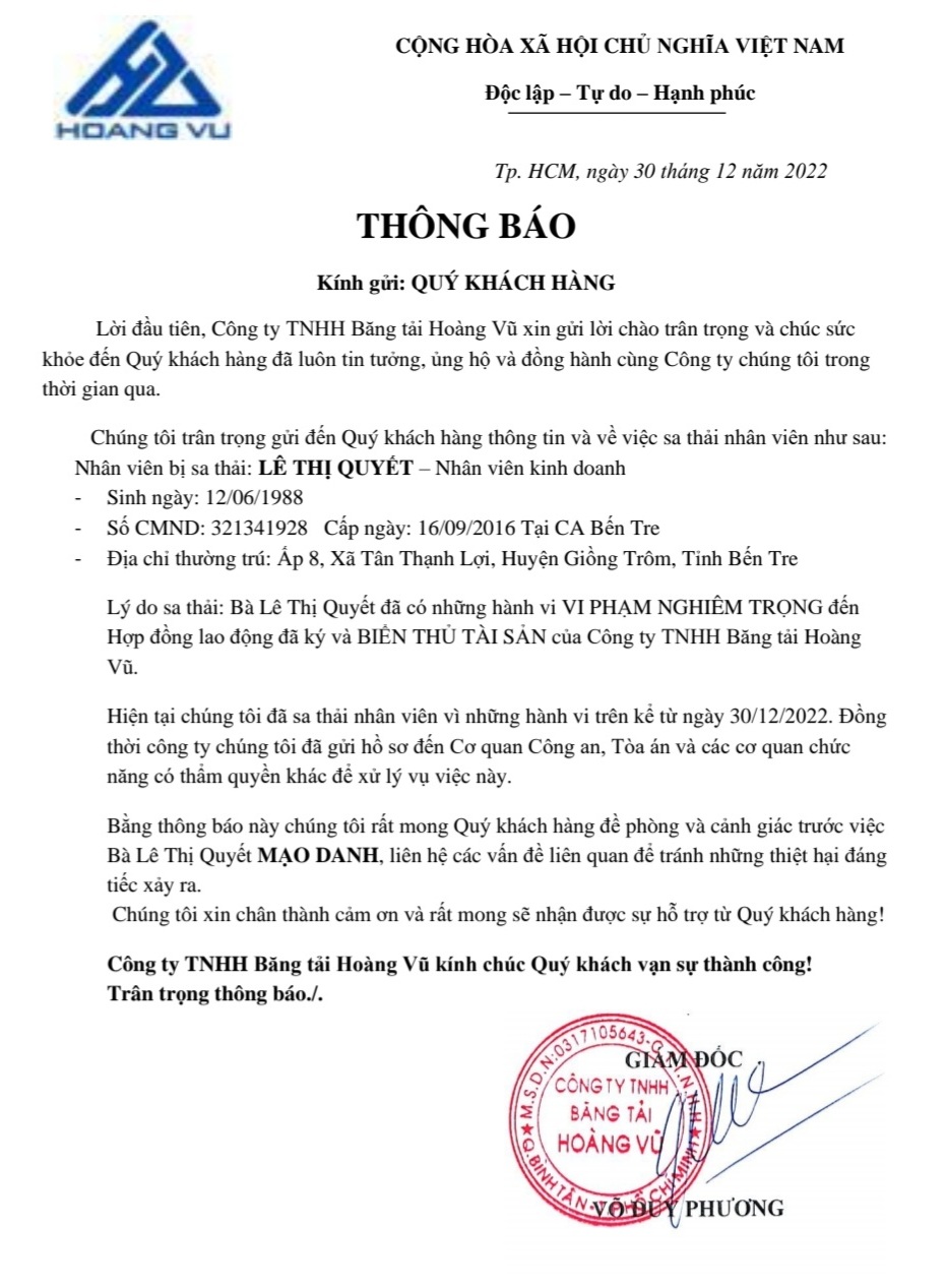 Công ty TNHH Băng tải Hoàng Vũ trân trọng thông báo đến quý khách hàng. Bà Lê Thị Quyết, sinh ngày 12/06/1988 đã bị sa thải từ ngày 30/12/2022.